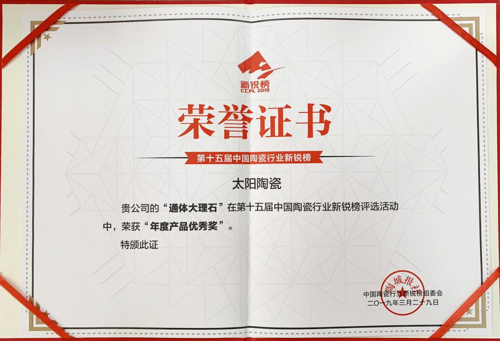太陽陶瓷榮獲陶瓷衛浴新銳榜“家裝用戶喜愛產品”大獎