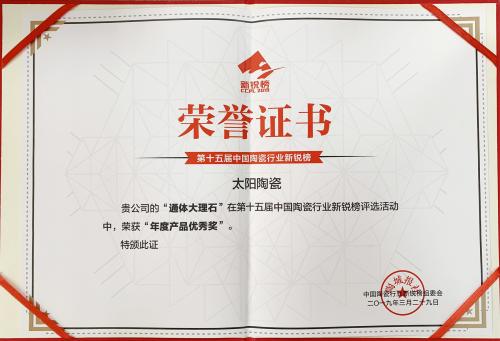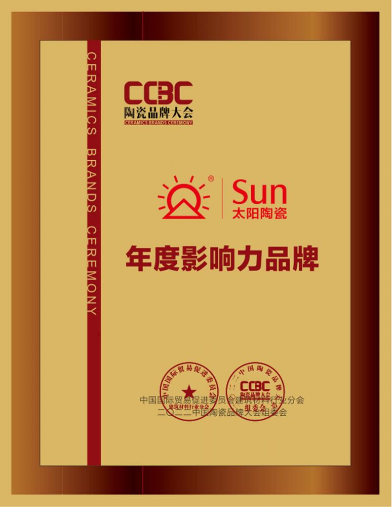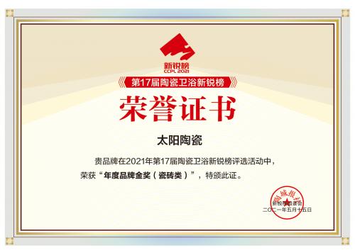 太陽陶瓷連續三年蟬聯陶瓷衛浴新銳榜/陶瓷品牌大會“年度影響力品牌”